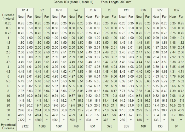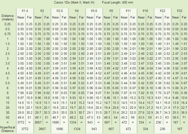 24mm랜즈 부터 400mm랜즈까지 조리개 및 거리에 따른 심도를 알 수 있다.