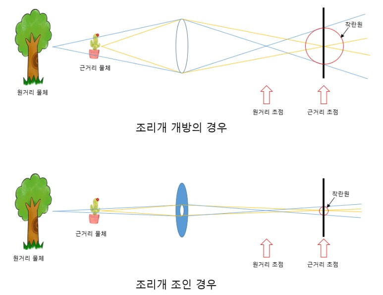 그림처럼 조리개를 열면 허용착란원이 생기는 평면의 범위가 좁아지고 초점면에서 멀어질수록 착란원이 커져서 인포커싱이나 아웃포커싱이 커지게 된다.